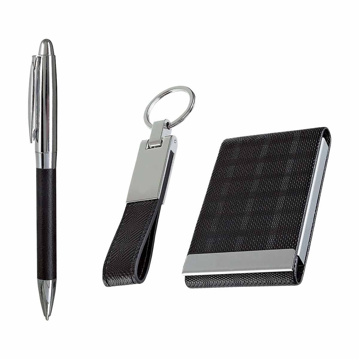 Incluye llavero, tarjetero, bolígrafo y caja de regalo.