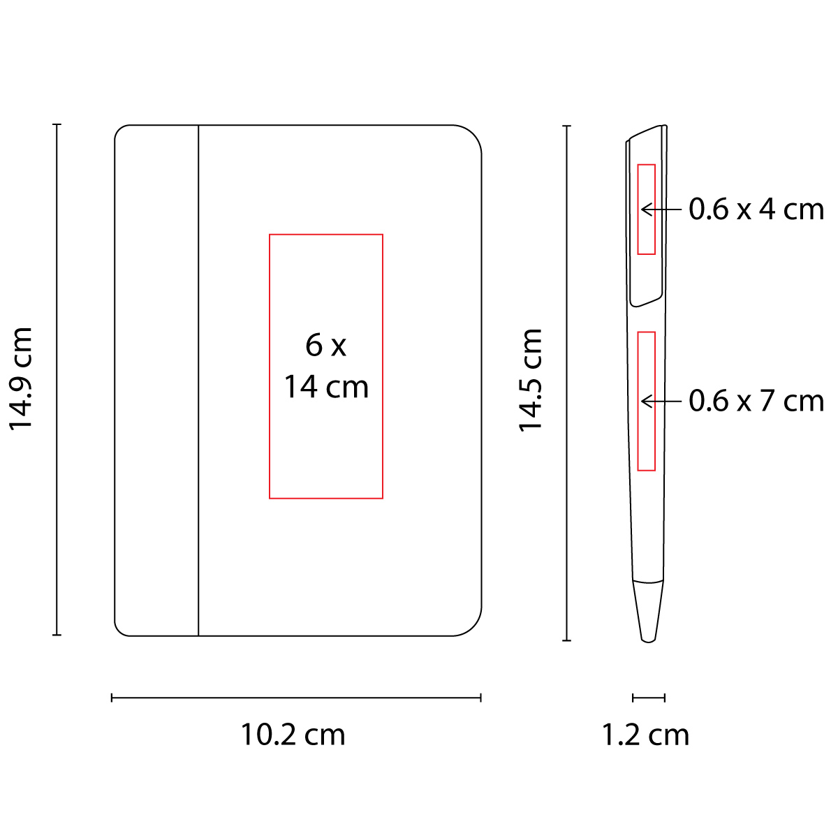 Medida:10.2 x 14.9 cm Libreta / 1.2 x 14.5 cm Bolígrafo