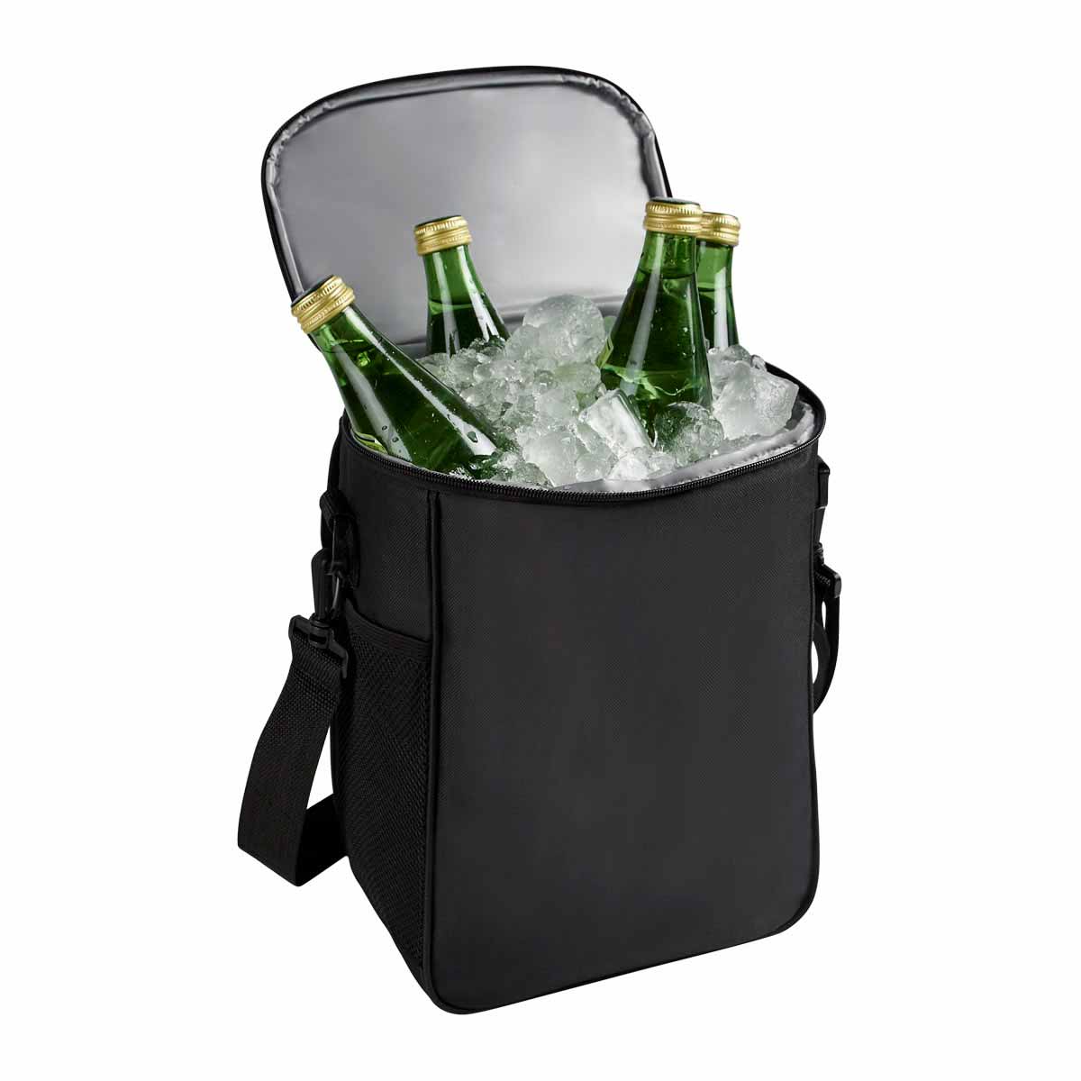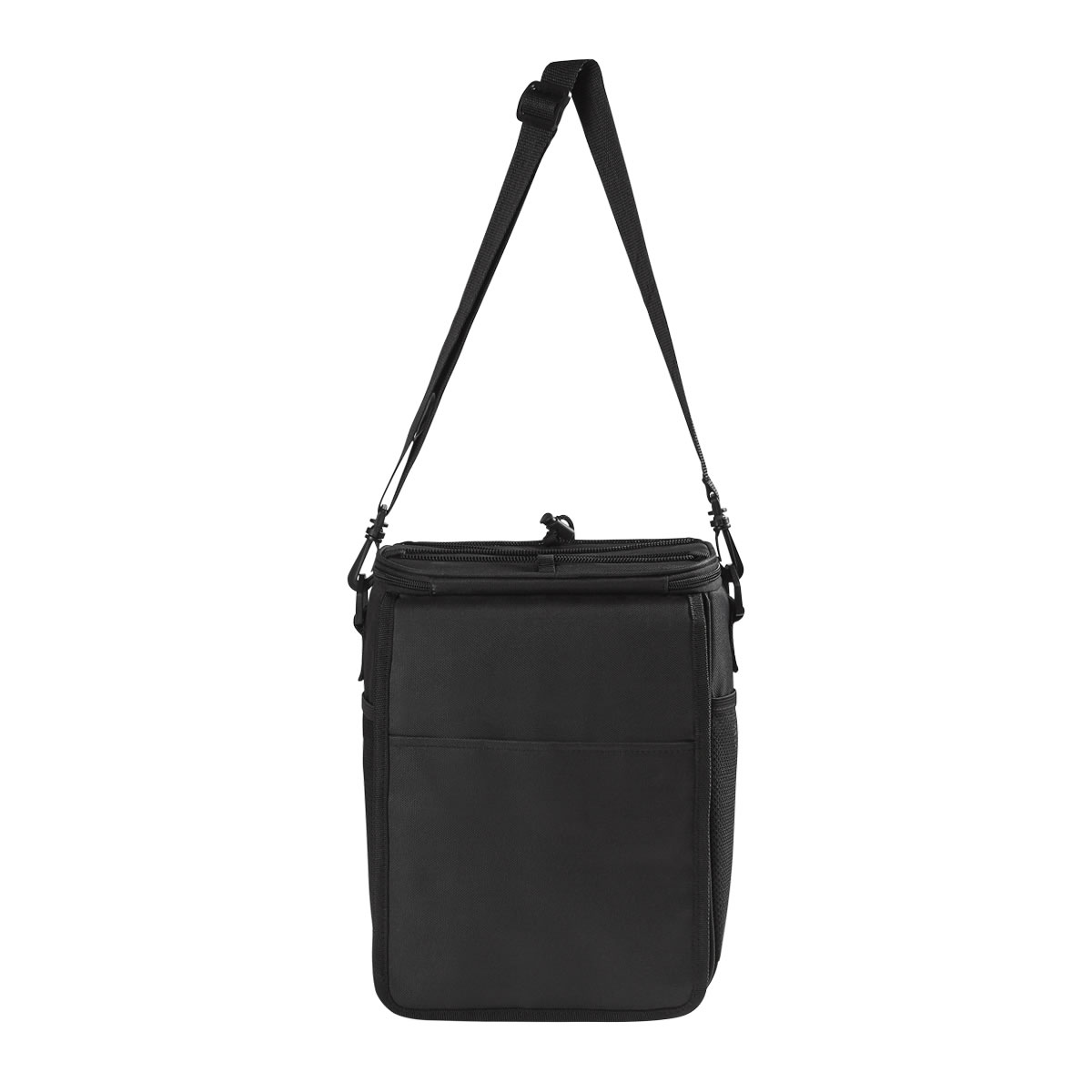 Bolsa principal con función de hielera. Incluye bolsa frontal con 3 compartimentos internos para el set de cuchillo, espátula y tenedor. Incluye asa para colgar en hombros y 2 bolsas laterales de red.