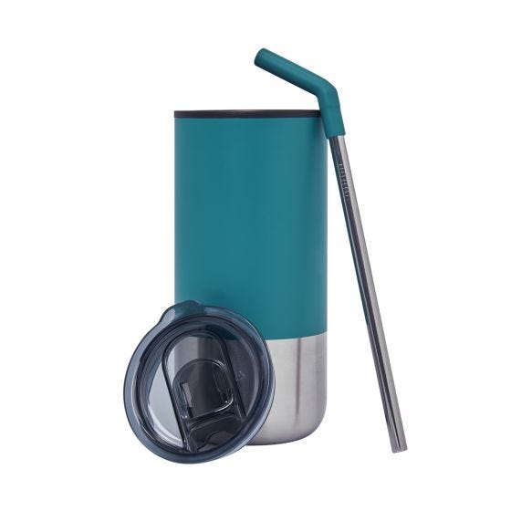 Termo doble pared. Interior de plástico y exterior de acero inoxidable. Tapa de plástico con válvula de seguridad y popote metálico con boquilla removible de rubber. Incluye caja individual.