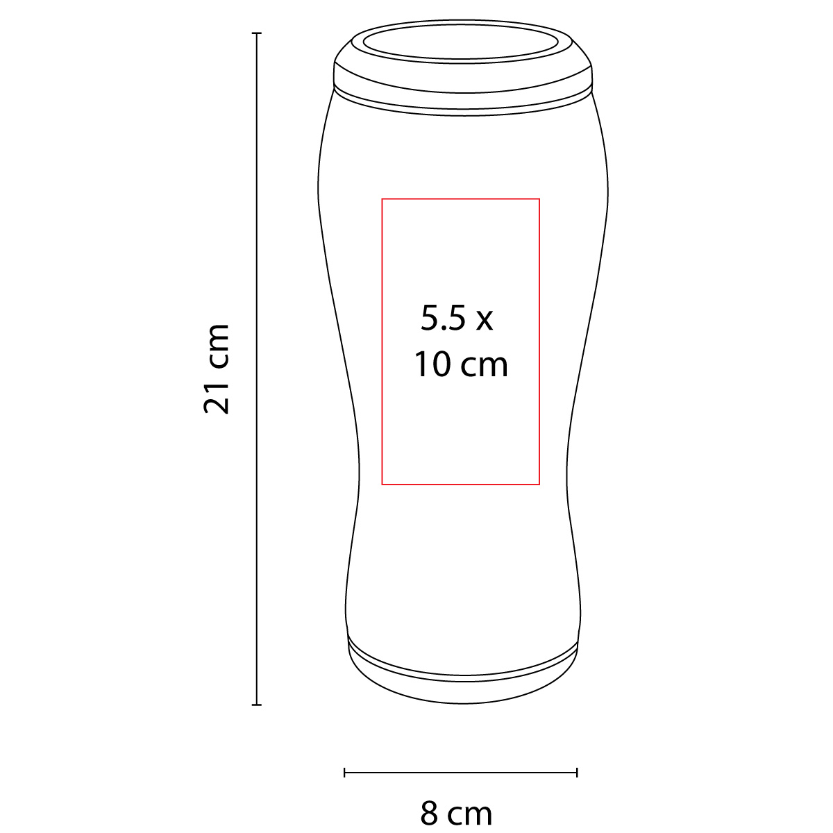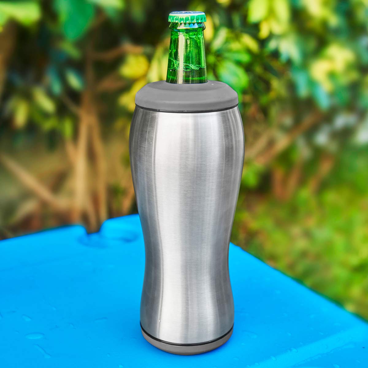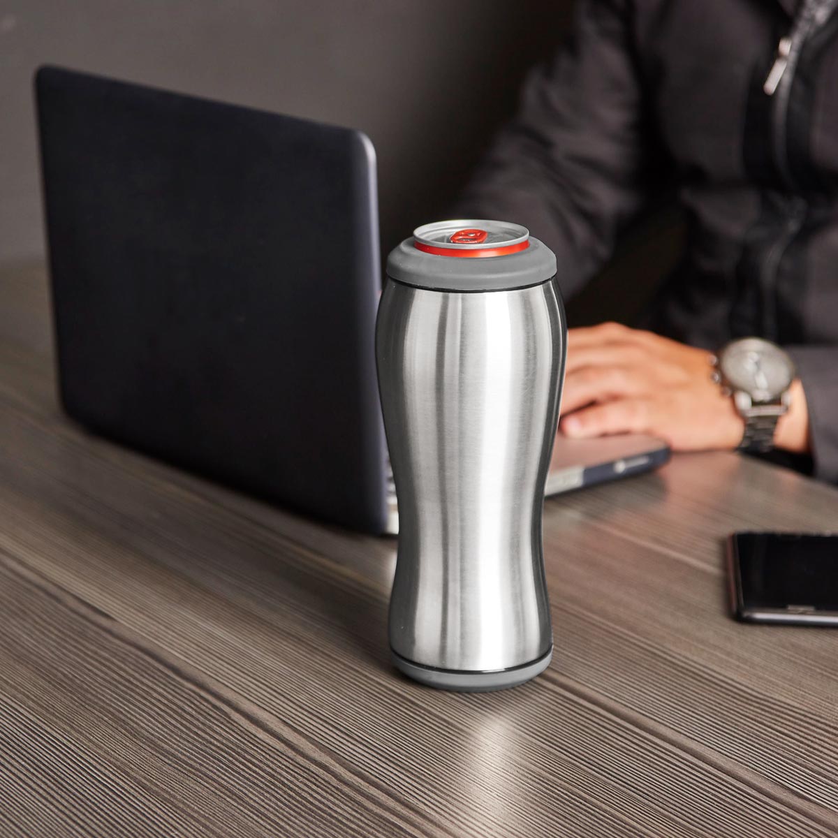 Doble pared. Pared interna y externa acero inoxidable. Tapas intercambiables para lata o botella. Mantiene la bebida fría.
